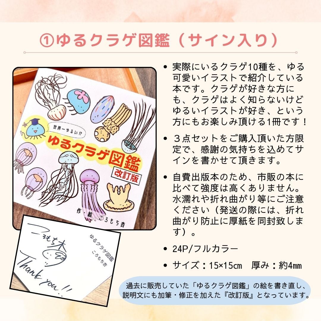 きのくら屋人気商品「ゆるクラゲ図鑑 改訂版(サイン入り)」「ゆるクラゲシール」「ゆるクラゲポストカード」のお得なセットです。